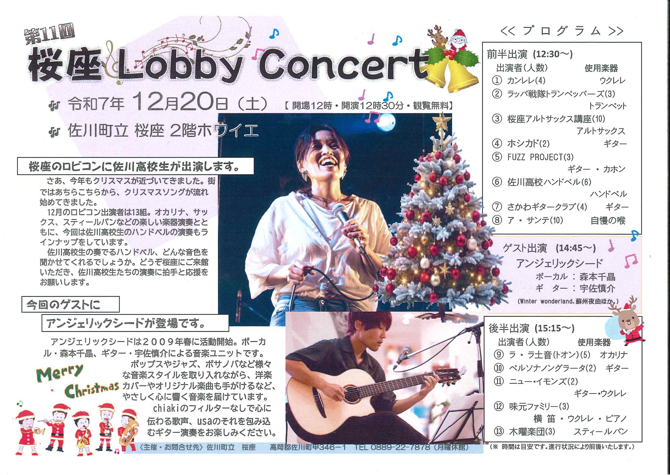 第11回桜座ロビーコンサート開催のお知らせ 2025 11/30 イベント情報 2025年11月30日 12月20日(土)に開催いたします。入場無料ぜひお越しください。 今回はゲストにアンジェリックシードさんをお迎えします。午後のひと時素敵な音楽を楽しみませんか? 今回は12時半からのスタートになります。 イベント情報 URLをコピーしました!
