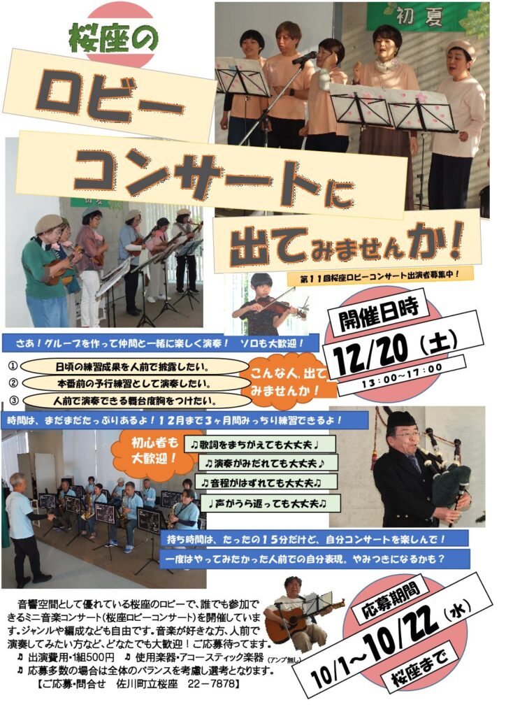 音響空間として優れいる桜座のロビーで 、誰でも参加きるミニ音楽コンサート(桜座ロビーコンサート)を開催しています。ジャンルや編成なども自由です。音楽が好きな方、人前で演奏してみたい方など、どなたでも大歓迎!ご応募待ってます。 -